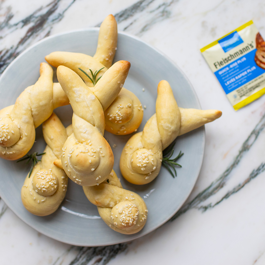 - Déposez la pâte sur un plan de travail et divisez-la en 12 portions égales. Roulez chaque portion en un boudin de 30 cm. Torsadez les boudins pour former le corps du lapin et écartez les deux extrémités pour former les oreilles. Formez une petite boule pour la queue et placez-la sur le dessus. Répétez l'opération avec le reste de la pâte.